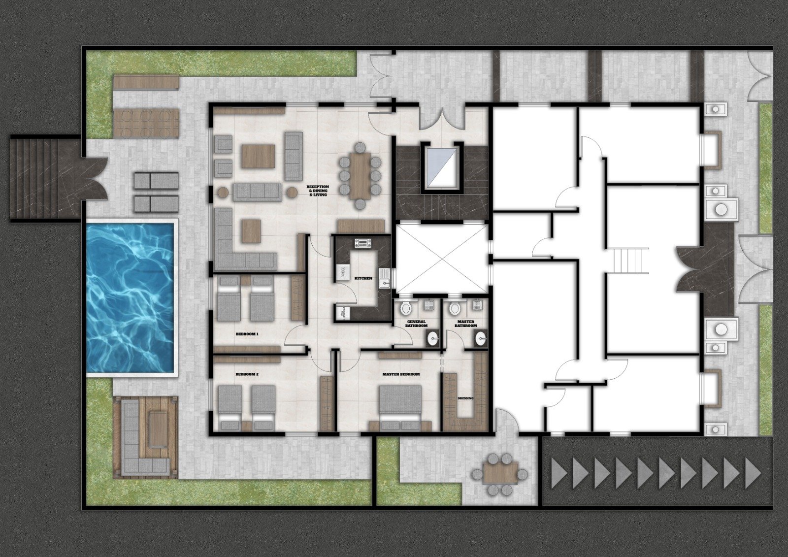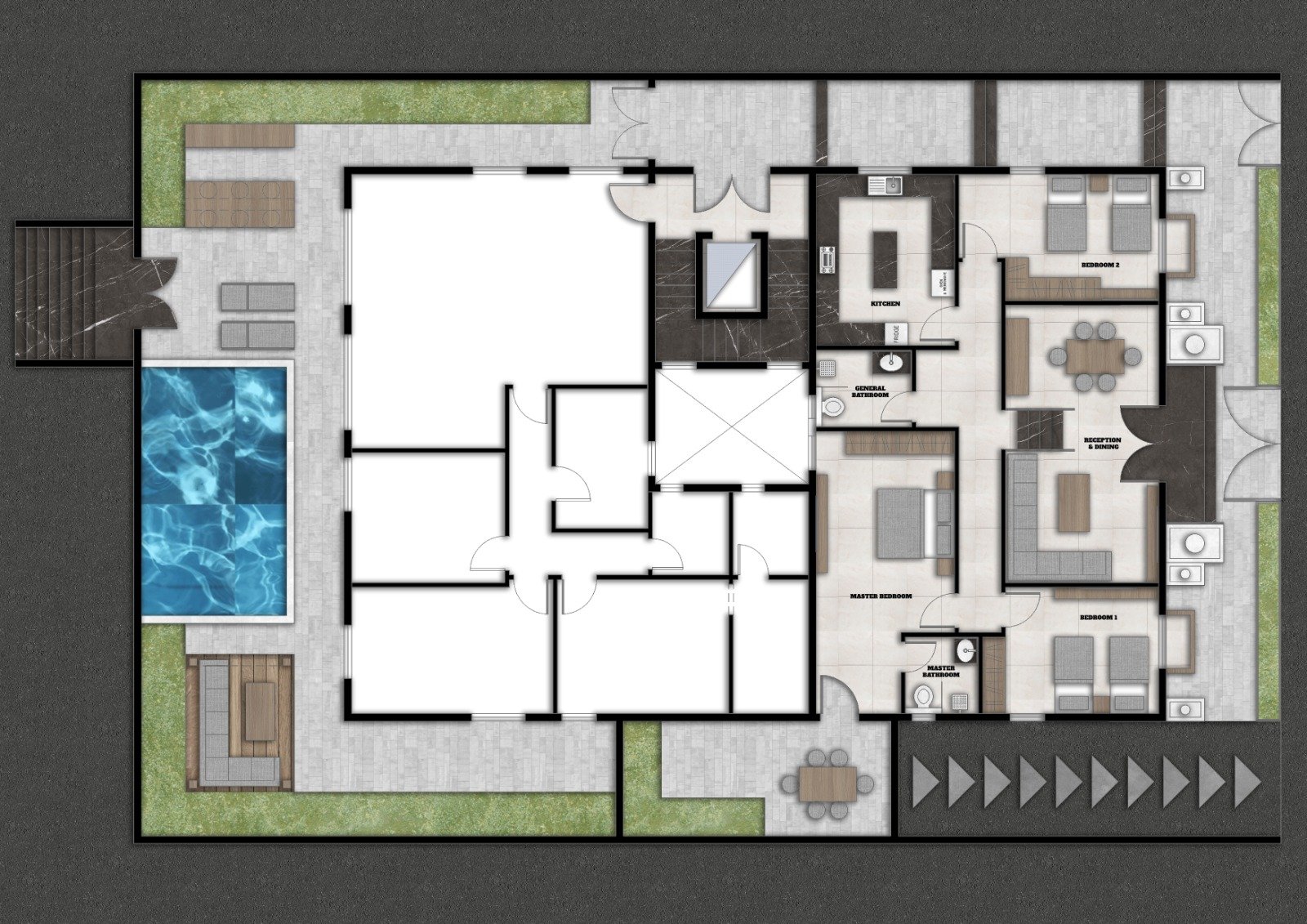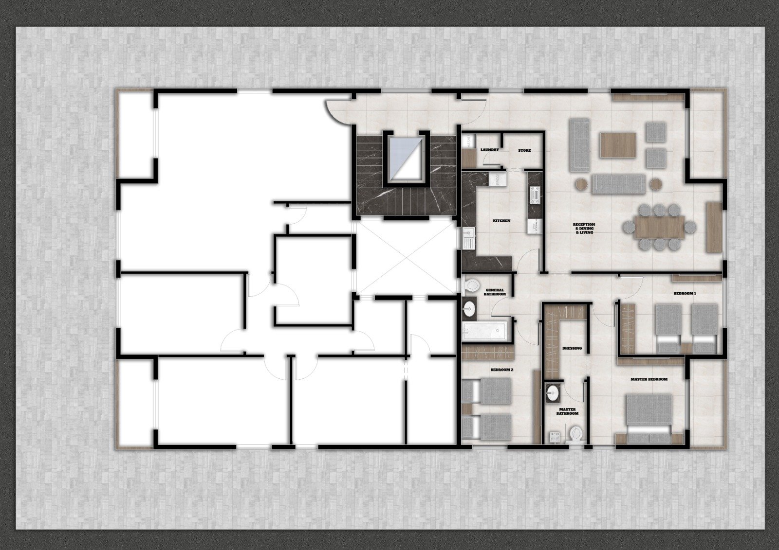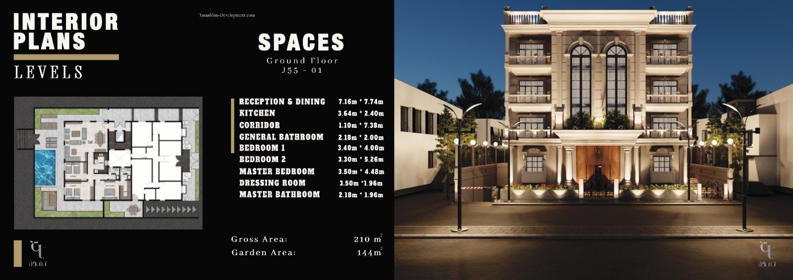 A double-face design with panoramic views. Each apartment has a full facade facing either the street or a large garden. The ground-floor unit is on two levels, with the reception area slightly lower for added privacy.