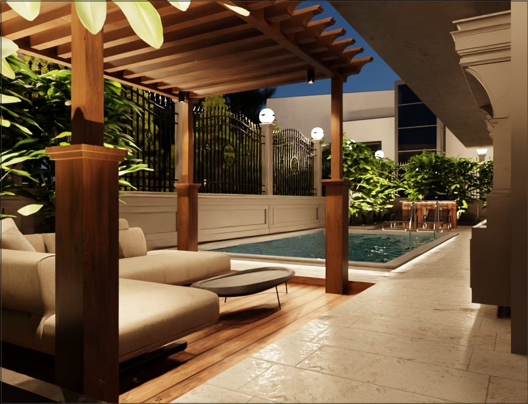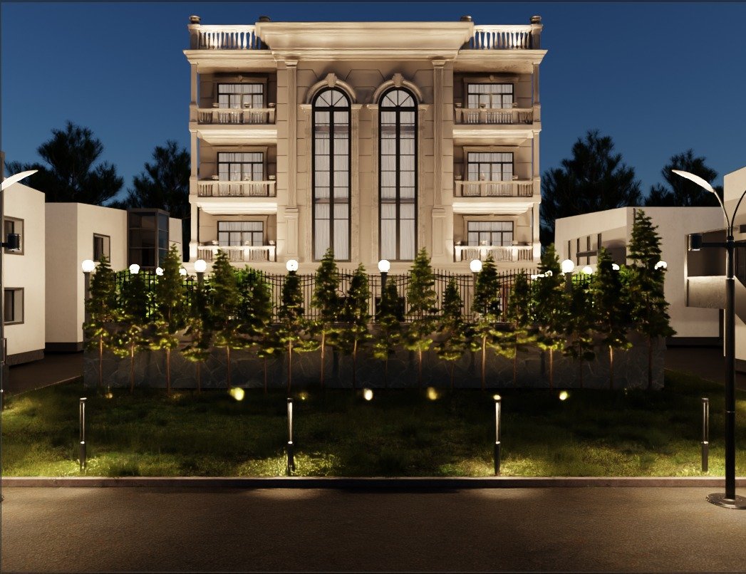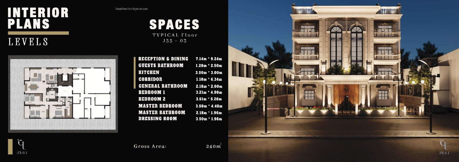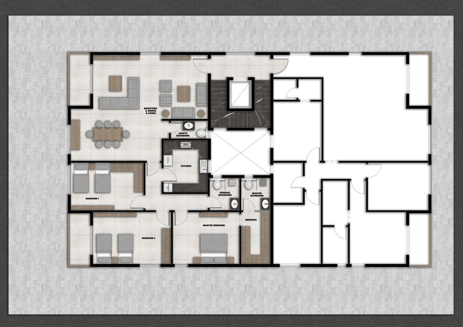A double-face design with panoramic views. Each apartment has a full facade facing either the street or a large garden. The ground-floor unit is on two levels, with the reception area slightly lower for added privacy.